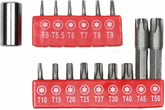 - Inclusief 16 verschillende bitjes: van T5 tot T50, met verschillende lengtes (25 mm en 50 mm) voor maximale flexibiliteit.